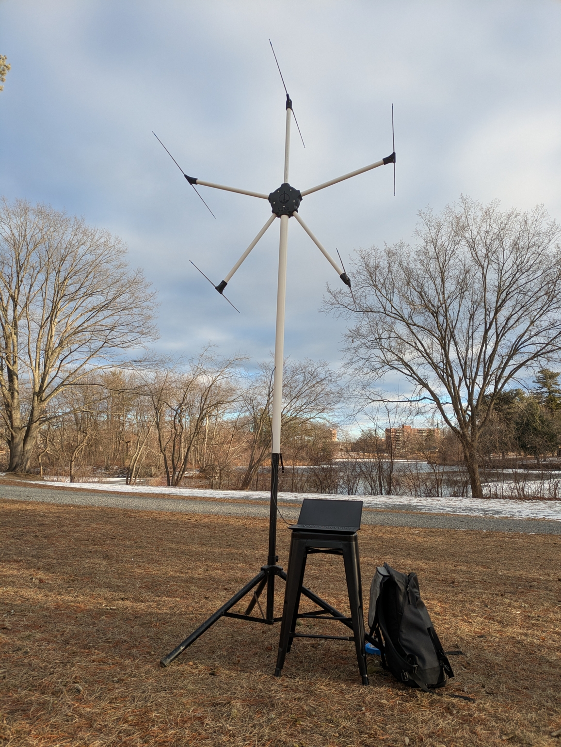 The radio source is a Light APRS, which transmits at 144 MHz and 1W. The DF antenna must work for rocket launches up to 30,000 ft. With a safety factor of 1.25, the free path loss is -99 dB. The receiving antenna is a dipole with 2.15 dBi of gain. I also account for -5 dB of loss on each end.