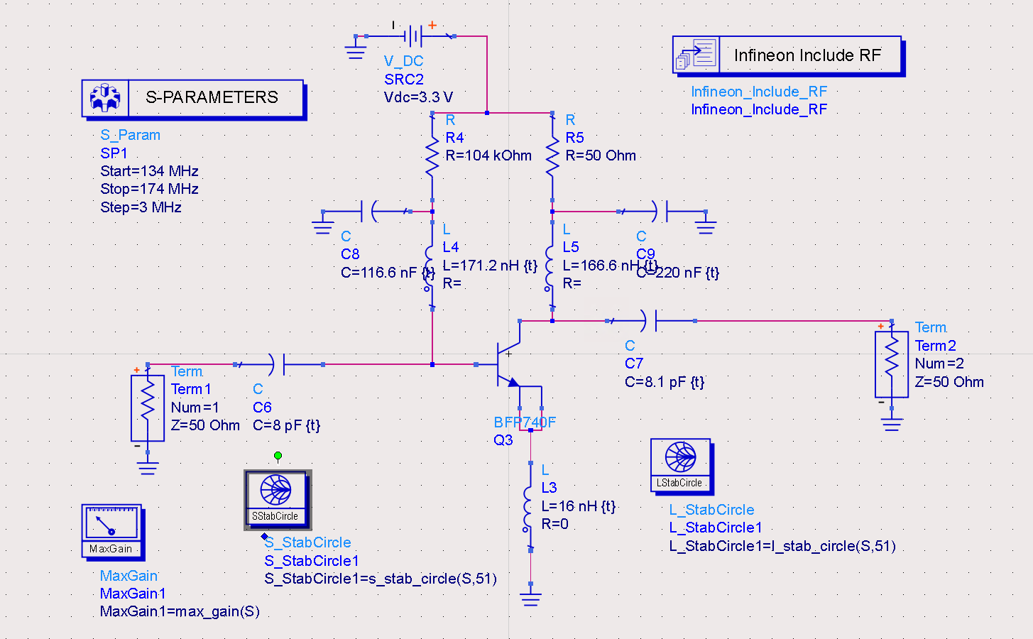 The BFP740F is a RF transistor with a noise factor of 0.8 dB and 30 dB of transducer gain. The transistor is implemented in a 50 ohm impedance matched inductively degenerated LNA.